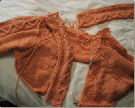 but I set it back and over time, in this cabin, mice ate part of the front and the other front was knit at the wrong tension..so I ripped it all apart and frogged the big pieces, keeping the cable bands (see photo, previous post)